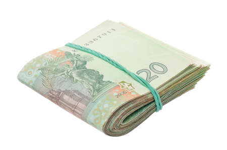 Warsaw, Poland - July 1, 2017: British currency. Roll of twenty pound notes held by rubber band