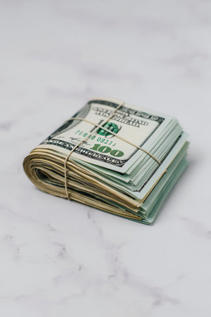 A neatly bundled stack of cash rests on a smooth marble surface, showing a clear organization of wealth. The banknotes are secured with rubber bands for easy handling