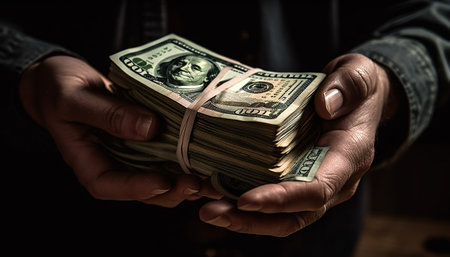 A close-up image of a hand holding a stack of cash, likely US dollars. The money is neatly stacked and secured with a rubber band, creating a visual representation of wealth and prosperity.