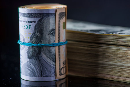 Roll of US one hundred dollar bills, selective focus