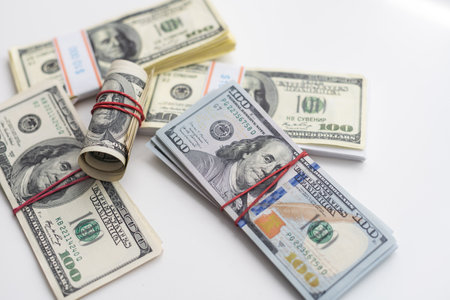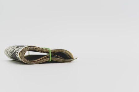 US dollar banknotes wad on a white tabletop with text space
