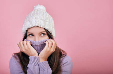 A charming girl with dark flowing hair under a snow-white hat with big green eyes covered her lips and nose with a throat from a delicately purple sweater that she holds with her hands. Looks sideway.