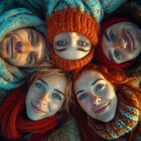 Diverse group of friends smiling together outdoors, dressed in cozy winter attire, capturing a moment of joy and connection in a lively and cheerful setting