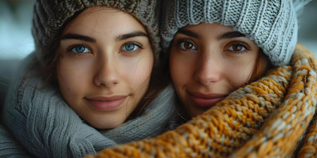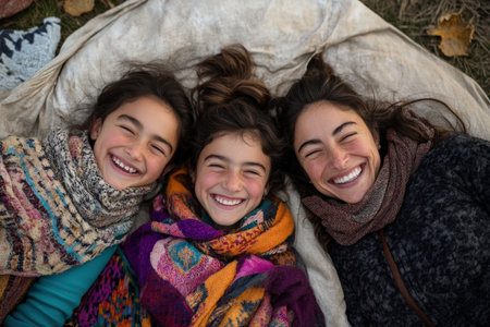 Experience a joyful family gathering outdoors, captured in radiant portraits of three women Vibrant scarves and warm smiles highlight a scene filled with laughter and heartfelt connection This image showcases pure happiness and bonding, perfect for visual storytelling, capturing the essence of a cozy and festive atmosphere AI Generative