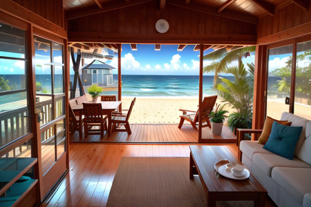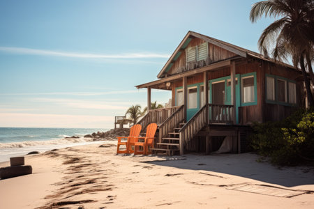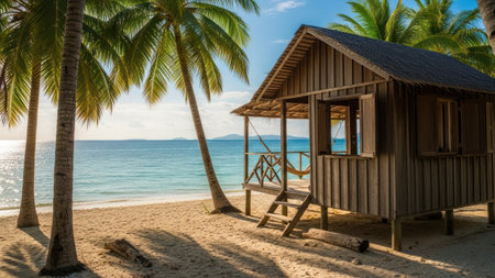 A wooden beach house stands on a sandy shore with palm trees. The house features a porch and open windows. Turquoise ocean water meets a clear blue sky in the background, creating a serene and inviting outdoor scene. Sunlight illuminates the setting.