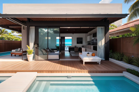 Home architecture design in Modern Style with Pool constructed by Concrete and Glass material. Modern architecture style. Generative AI AIG25 .