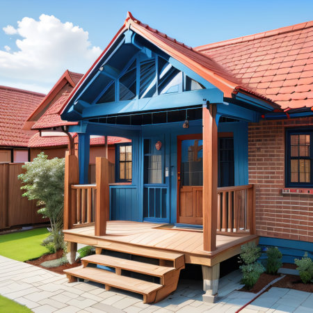 A well-maintained house with a dark blue exterior is the focal point of the image, showcasing a welcoming entrance. The scene is enveloped by vibrant greenery and soft lighting suggesting a warm atmosphere. This image could be used for real estate marketing, home decor, or general lifestyle publications.