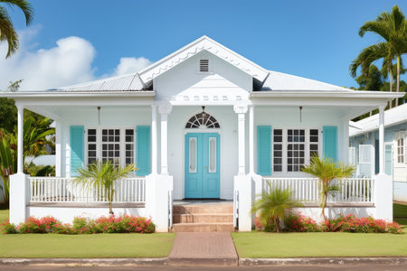 colonial house, white exterior and blue central front door, created with generative ai
