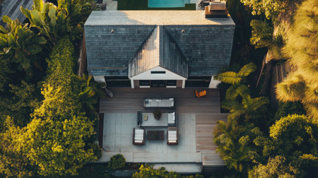 Top view of a charming coastal home with a spacious patio, ideal for text or branding