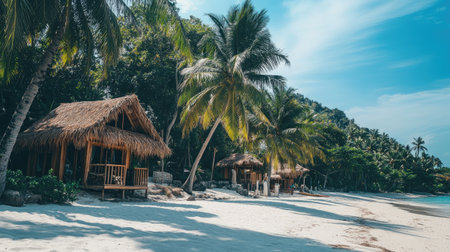 Experience a peaceful beachside paradise featuring palm trees, thatched roof huts, and pristine sand under a vivid blue sky, perfect for relaxation.