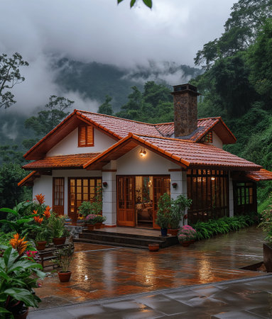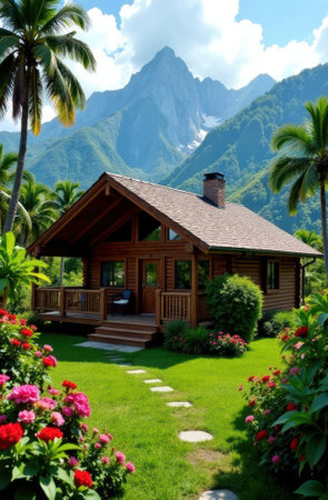 Charming wooden chalet surrounded by lush tropical vegetation, flowers, and majestic mountains, creating a serene and idyllic retreat