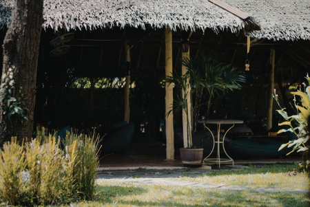 A serene tropical hut with a thatched roof nestled in a lush, green garden. The hut is surrounded by vibrant plants and trees, with a small table and chair set outside.