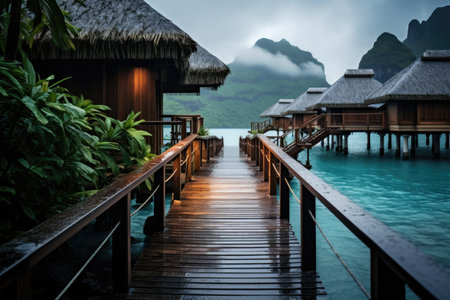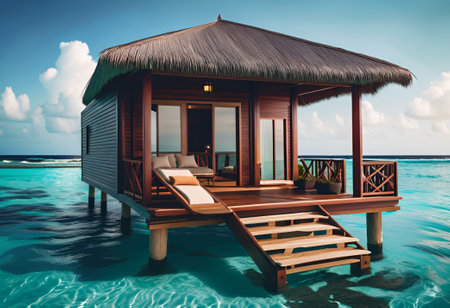Serene morning landscape featuring a luxurious overwater bungalow with a thatched roof in a tropical paradise