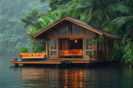 cozy jungle bungalow nestled among lush greenery and wildlife. The perfect retreat for those seeking adventure and tranquility. AI Generative AI.