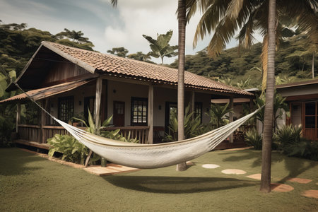 Contemporary Latin American countryside cottage hammock. Tropical vacation residence garden hanging bed. Generate ai