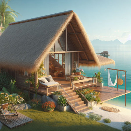 Experience a tranquil retreat in a picturesque wooden cabin overlooking a stunning tropical beach. Lush greenery and calm waters create a serene escape.
