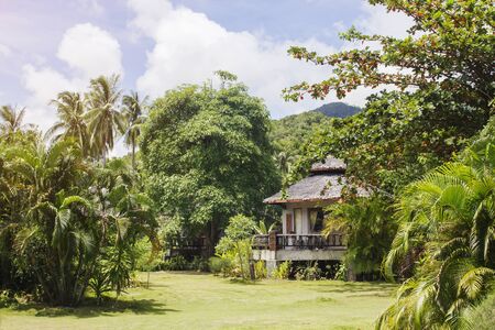 Bungalow on the shore of a paradise island. House on an island under palm trees among the blue water of the ocean