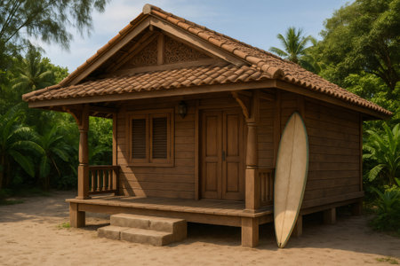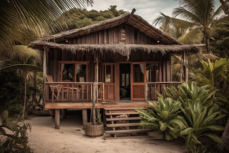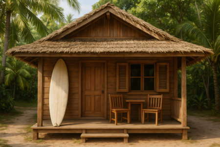Charming wooden bungalow with thatched roof, surfboard, and chairs on the porch, nestled in a tropical paradise