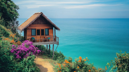 A picturesque wooden cottage perched on stilts by the ocean, surrounded by lush greenery and vibrant flowers, ideal for a serene escape in a tropical paradise.
