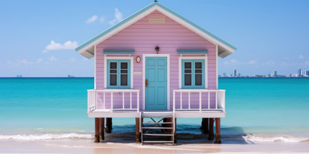 A pink beach house with a blue door on the beach. Generative AI image.
