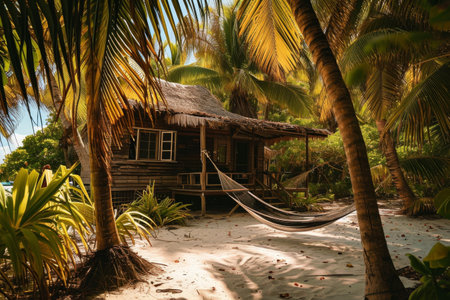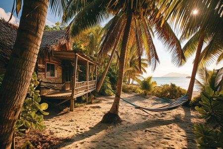 A Caribbean beach house with hammock, surrounded by palms, A charming and rustic beachside bungalow in the Caribbean, with a cozy and laid-back atmosphere Ai generated