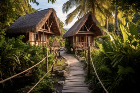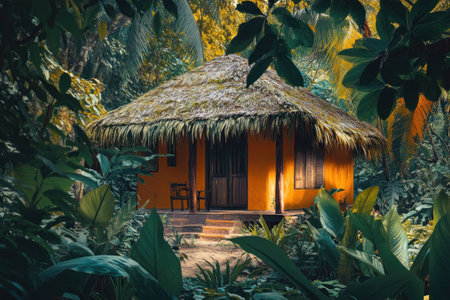 Tropical eco friendly cottage surrounded by lush greenery and vibrant foliage, creating a serene and inviting atmosphere for relaxation
