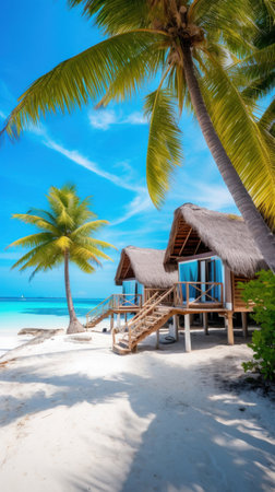 This captivating image captures a serene beach house nestled on a tranquil island, surrounded by vibrant palm trees and inviting turquoise waters.