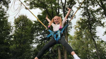 Little girl flies on elastic bands and jumps on a trampoline