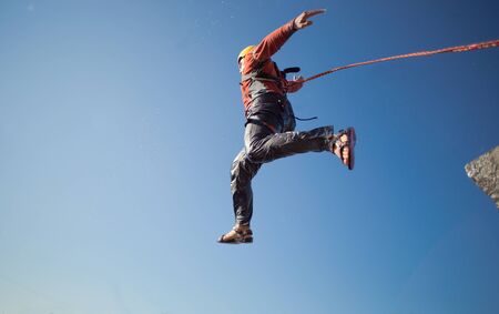 Belarus, Gomel, May 06 2017.Jumping with a rope.Flight down on the rope.Engage in ropejumping.Dangerous hobbies