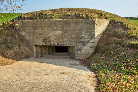 Nachod, Czech Republic - October 18, 2022: Artillery fortress and bunker Dobrosov, built in year 1938-39. Bunker, museum and underground. Czech Republic. Defocused