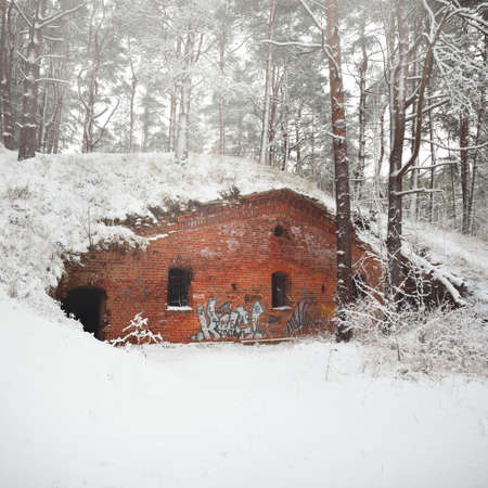 An old abandoned red brick military pillbox in the middle of the snow-covered forest. Latvia, Europe. Landmarks, architecture. History, past, war, conflict, fortification, protection themes