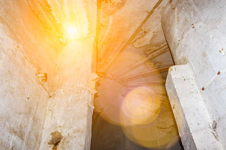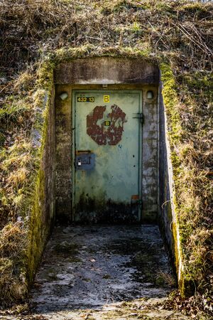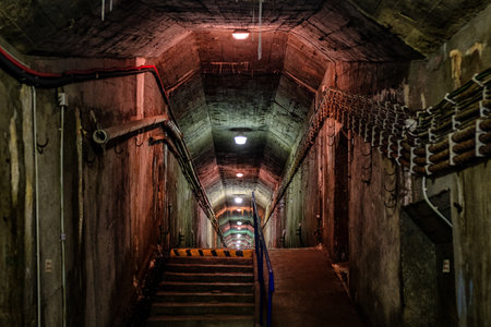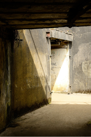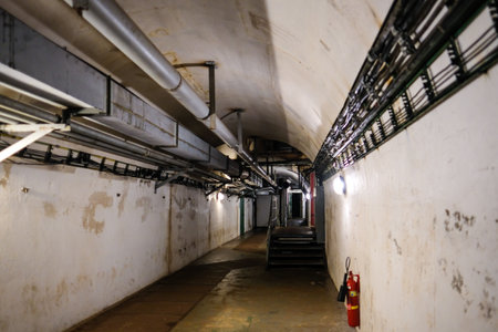 Tunnel of abandoned dirty Soviet bunker, echo of Cold War.