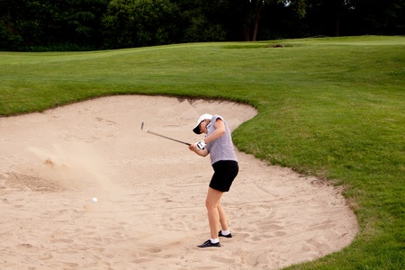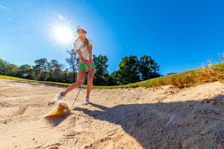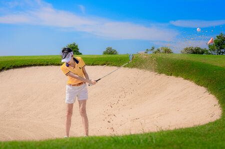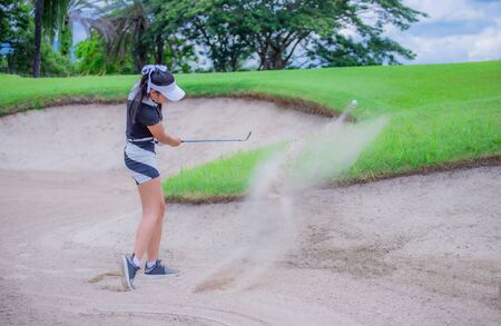Woman golf player in action of hitting golf ball away from a trouble sandbank bunker in golf course, trouble away keep going concentrate to final destination