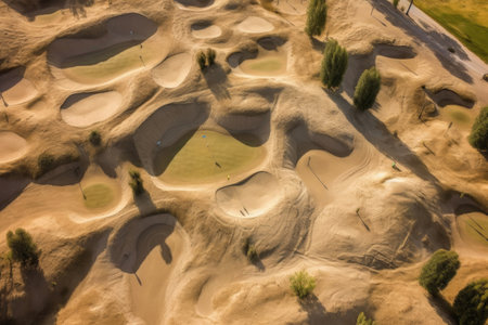 aerial view of a pristine golf course with sand bunkers, created with generative ai