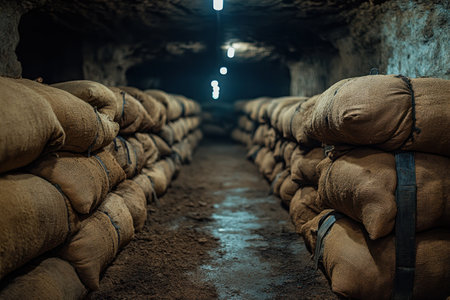 Father and sons descending into a concrete underground shelter, seeking refuge and safety during a natural disaster or earthquake emergency, emphasizing preparedness and family survival