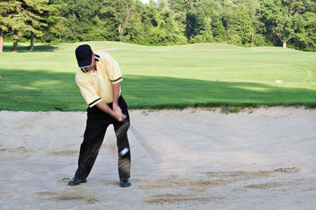 Male golfer shoting golf ball from sand bunker. Handsome asian golfer hitting golf ball with sand blast.