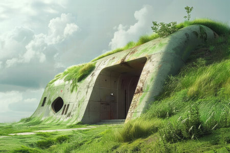 Coastal Concrete Bunker Seascape Dramatic Blue Sky Grass old day art sand dune wind calm view grey