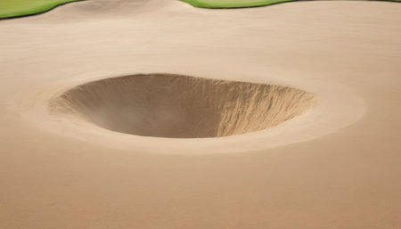 A tranquil view of a golf course bunker with a gentle slope, soft sand, and lush green grass under a bright blue sky. Perfect for nature and outdoor enthusiasts.