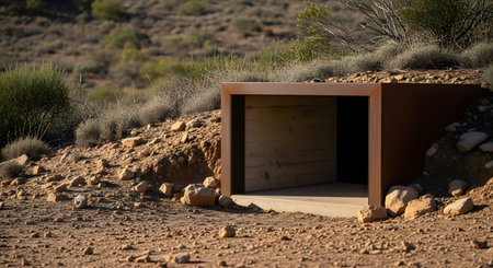 A stark, modern concrete structure with a dark opening, nestled into a dry, rocky hillside with sparse vegetation.