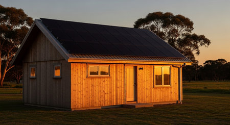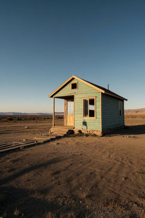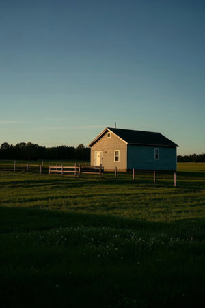 A rustic wooden house stands alone among tall grass with large windows reflecting the natural surroundings. The calm blue sky enhances the serene rural atmosphere.