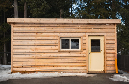 Small wooden cabin house in the evening. exterior design. Small house for holidays. Log cabin in a forest in the winter. Travel photo, nobody
