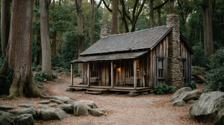A rustic wooden cabin forest autumn stone chimney cozy porch peaceful nature