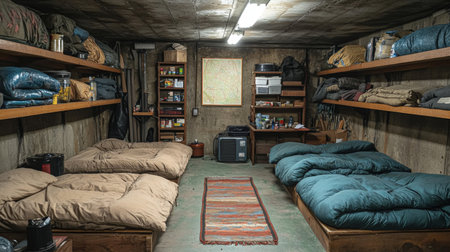 Comfortable sleeping quarters in a well-organized underground shelter with bedding and supplies. Generative AI