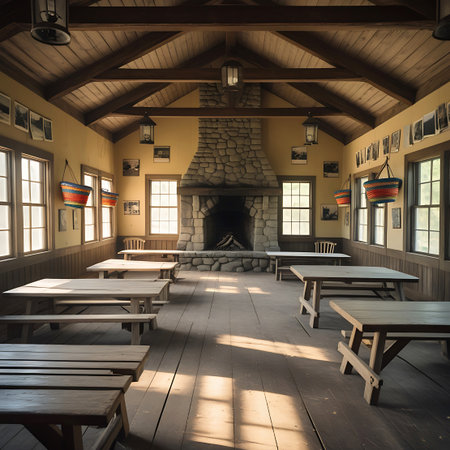 The interior of a rustic cabin with a large stone fireplace, wooden tables and benches, and exposed wooden beams.