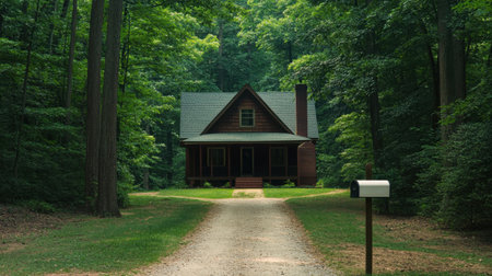 Isolated retreat house with gravel road, mailbox, and dense evergreens around