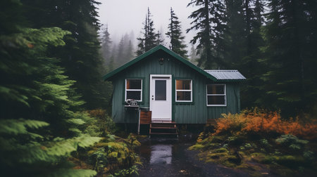 A modern cabin made of wood stands in a forest setting, surrounded by tall trees. The exterior features a teal door and large windows, reflecting the natural light. The composition showcases a pathway leading to the cabin, with focus on the architecture and natural elements. Suitable for illustrating travel, architecture, or lifestyle content.