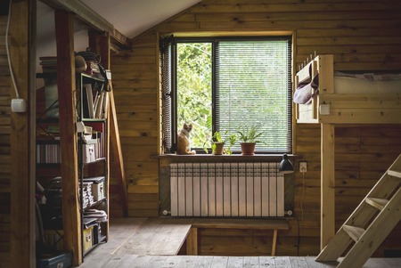 Quiet time in a wood cabin, secluded life in a forest cabin