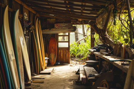 Surfer's beach shack with surfboards strewn all around Ai generated