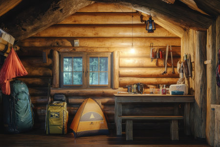 A warm, inviting log cabin interior features camping gear and a friendly atmosphere, perfect for outdoor lovers.