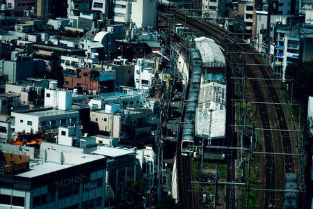 Monochrome landscape of railway and buildings. Shooting Location: Shinjuku Ward, Tokyo